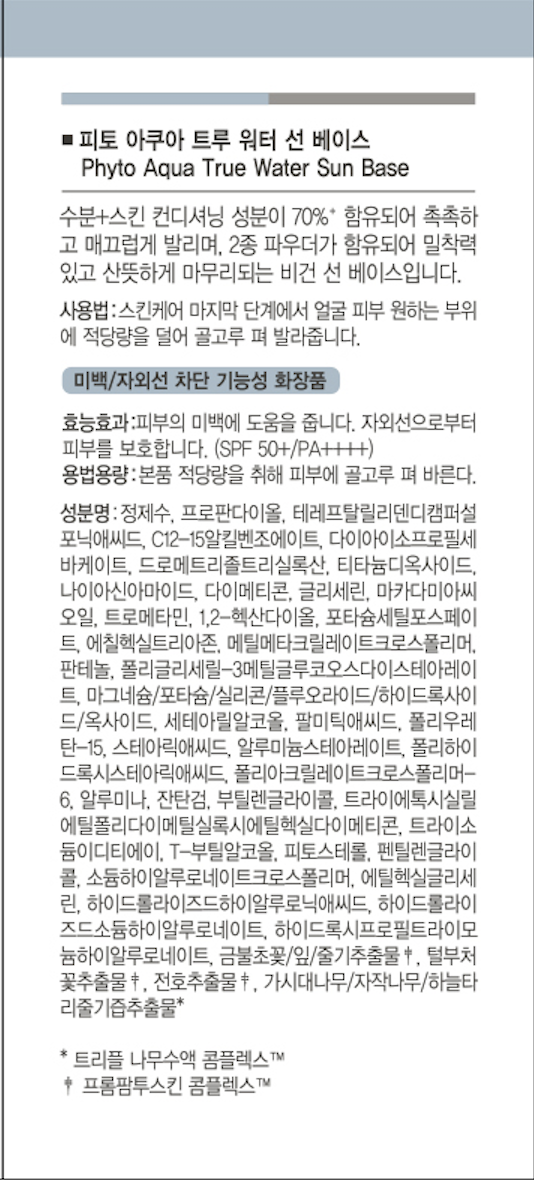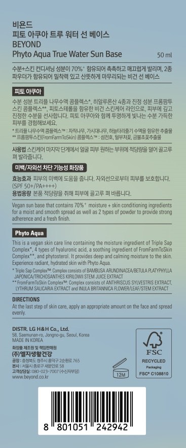 [비건라이프] 비욘드 피토 아쿠아 트루 워터 선 베이스 SPF50+ PA++++, 50ml, 1개 요약정보 및 구매