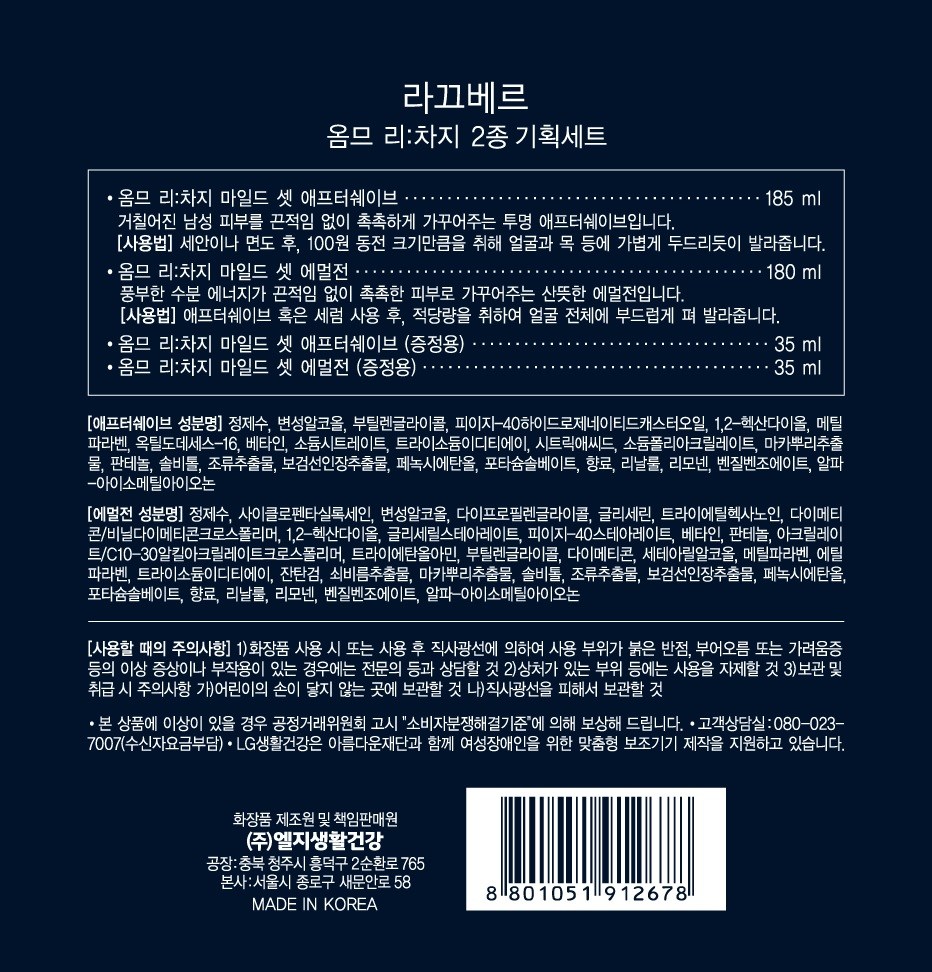 • 라끄베르 남성용 옴므 리차지 마일드셋 2종 기획세트, 1세트